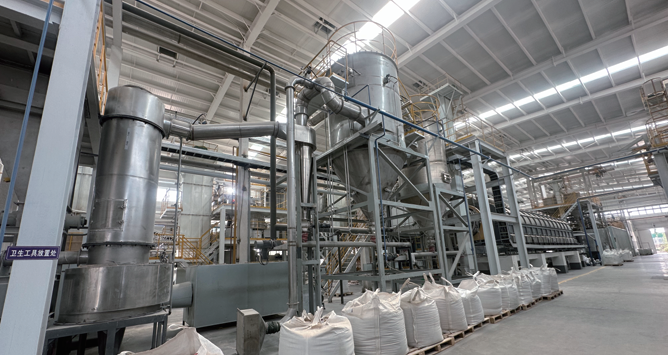 干燥好的物料通过管道进入布袋除尘器进行气固分离,通过布袋除尘器下方的旋转阀定量出料,然后通过螺旋输送或溜管输送,送至回转窑的加料螺旋内,通过加料螺旋定量连续送入回转窑筒内,由回转窑进料端处的多道内螺旋板将物料连续均匀导入回转窑焙烧段,对物料进行二次干燥、焙烧。筒体外围有导热钉,大大增加了换热面积。各段焙烧段筒体内设有抄板(抄板可针对不同物料特性进行设计),保证物料焙烧均匀,扬尘少。干燥焙烧完成后的物料通过冷却窑进行一次冷却,冷却后物料经出料罩下方的旋转阀进入冷却螺旋进行二次冷却、增密,二次冷却后可进入包装工段。