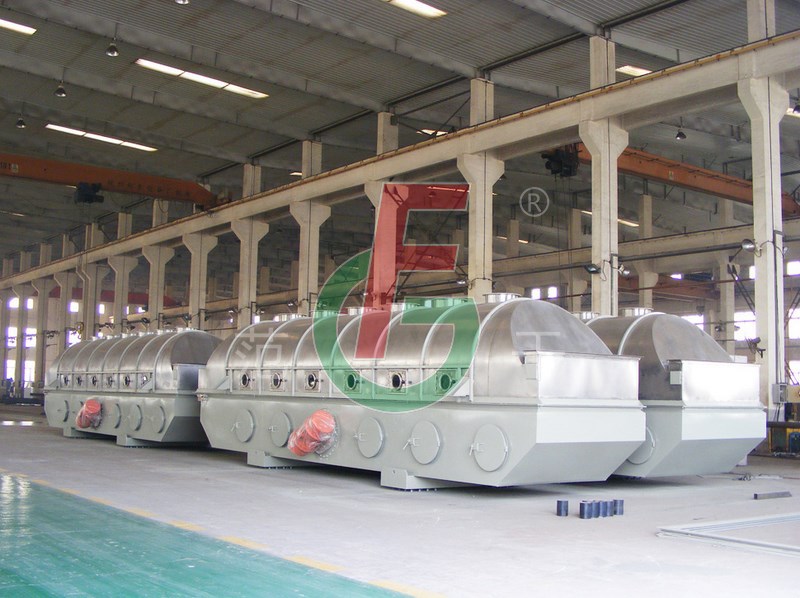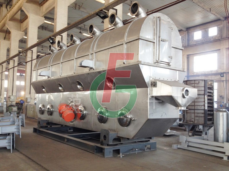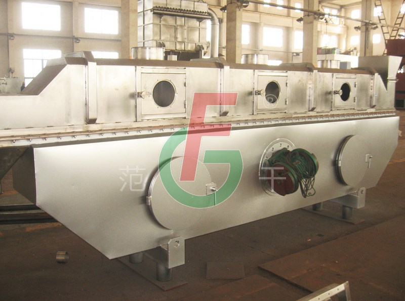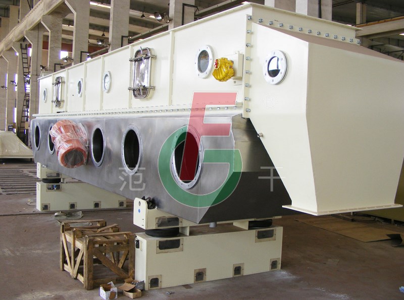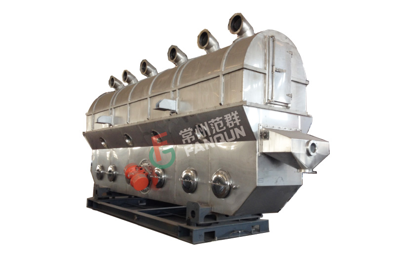 物料自进料口进入机内,在振动作用下,物料沿流化床水平方向抛掷向前连续运动,热风向上穿过流化床同待处理物料进行热质后,湿空气经旋风分离器除尘后由排风口排出,干燥物料由排料口排出。