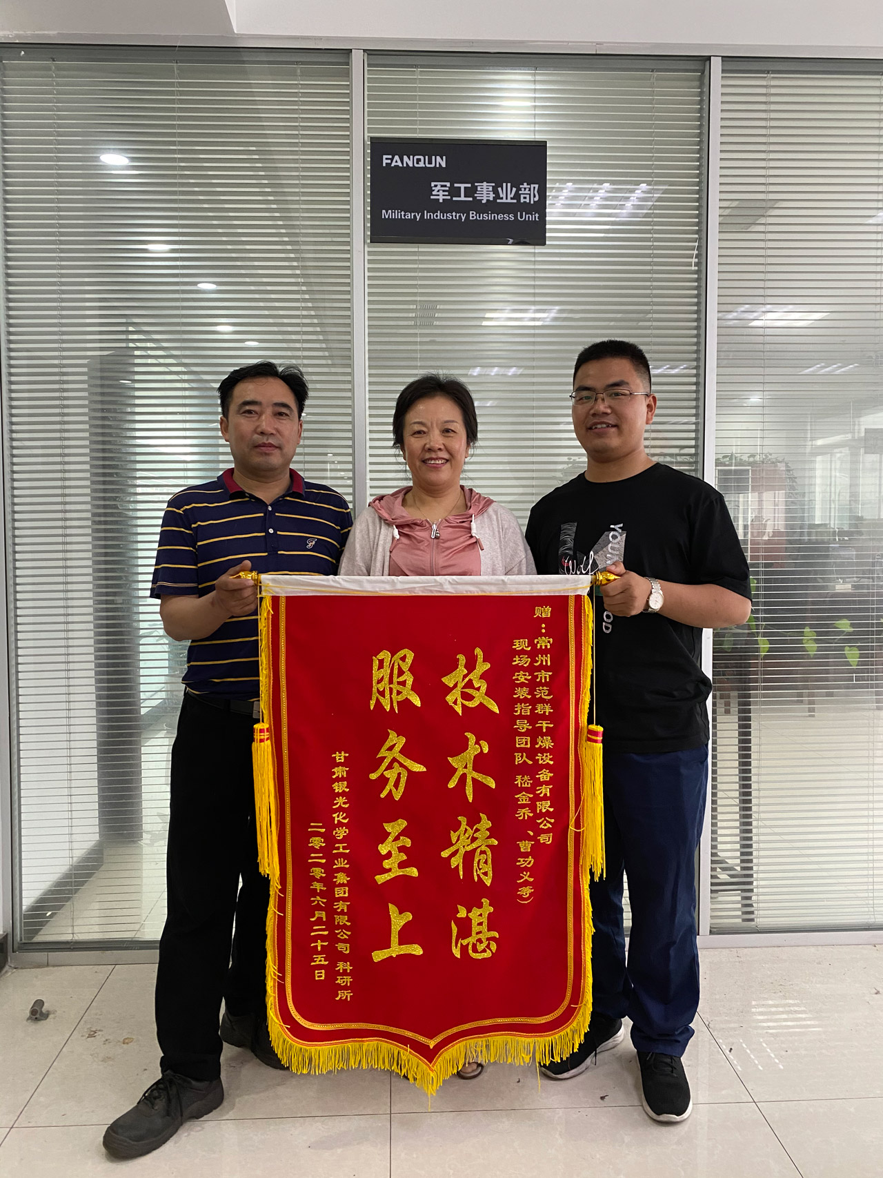 3月 26日,常州范群派出以嵇金乔为主的现场安装指导团队,该团队秉承“服务于用户,创精品工程”的理念,他们克服了高原反应,水土不服的生理不适;克服了疫情导致工期延误的影响;克服了项目指导安装中所遇到的各种困难,不屈不挠、加班加点、通宵作业、确保项目按时完工并通过验收。常州范群这种全心全意服务于客户的态度、吃苦耐劳打硬仗的精神,也获得用户的高度认可。为此,甘肃银光化学工业集团有限公司科研所特别为常州范群现场指导安装团队颁发了“技术精湛 服务至上”的锦旗。他们用自己的不懈努力为常州范群、为自己赢得了荣誉。