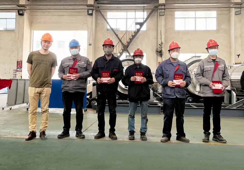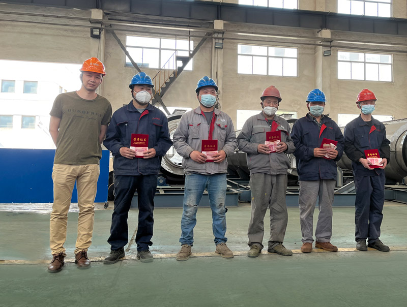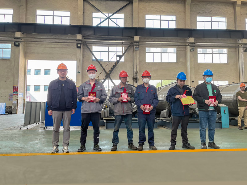 公司总经理范琪、工会主席张涛对获得“五一车间劳动模范”荣誉称号的劳模先进们进行颁奖表彰。