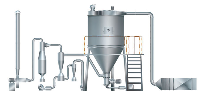 空气经过滤和加热,进入干燥器顶部空气分配器,热空气呈螺旋状均匀地进入干燥室。料液经塔体顶部的高速离心雾化器,(旋转)喷雾成极细微的雾状液珠,与热空气并流接触在极短的时间内可干燥为成品。成品连续地由干燥塔底部和旋风分离器中输出,废气由引风机排空。