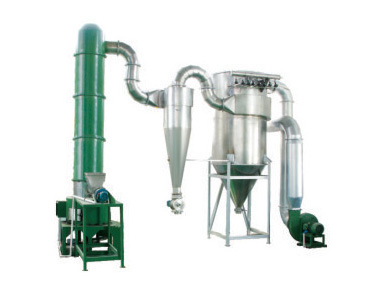 热空气切线进入闪蒸干燥机底部,在搅拌器带动下形成强有力的旋转风场。膏状物料由螺旋加料器进入干燥器内,在高速旋转搅拌桨的强烈作用下,物料受撞击、磨擦及剪切力的作用下得到分散,块状物料迅速粉碎,与热空气充分接触、受热、干燥。脱水后的干物料随热气流上升,分级环将大颗粒截留,小颗粒从环中心排出干燥器外,由旋风分离器和除尘器回收,未干透或大块物料受离心力作用甩向器壁,重新落到底部被粉碎干燥。