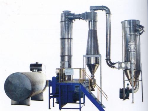 旋转闪蒸干燥机是二十世纪八十年代在国外新推出的一种将干燥技术和流态化技术综合为一体的新型干燥设备,它克服了喷雾干燥设备高,能源消耗大和流化床干燥不均匀的缺点,集两者之所长。成为具有高效、节能、快速等特点的理想干燥设备。它特别适合于高黏度膏状物、滤饼等物料的直接干燥,并可一次获得颗粒微细的粉体,弥补了耙式干燥效率低、产量小的不足,改变了喷雾干燥先稀释再进行喷雾处理的复杂过程。由于热风与物料接触时间短,可以对触变性、热敏性物料及生物菌体进行干燥,并具有防止焦化变色的作用。