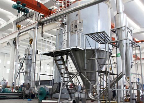 经球磨好的料浆在搅拌槽内进一步的被搅拌均匀并加热至35℃以上,然后向搅拌槽内施加压力,在压力的作用下,料浆被送至雾化器,经雾化器雾化后从塔体下部喷入塔体内。经油气热交换器加热的N2被送风机送至塔体顶部的气体分配器,经气体分配器后,N2均匀地、呈旋风状地进入塔体,对雾化了的料浆进行干燥制粒。料粒与热气体接触后其表面的液体便迅速蒸发,而内部的气体在其后的干燥过程中迁移到表面被热气体带走。干燥后的料粒落到塔体底部,通过一对碟阀进行间隙式回收。