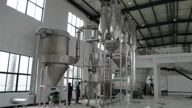 气流干燥机是利用高速流动的热气流使湿淀粉悬浮在其中,在气流流动过程中进行干燥。具有传热系数高,传热面积大,干燥时间短等特点。气流干燥也称“瞬间干燥”是固体流态化中稀相输送在干燥方面的应用。该法是使加热介质和待干燥固体颗粒直接接触,并使待干燥固体颗粒悬浮于流体中,因而两相接触面积大,强化了传热传质过程,广泛用于散状物料的干燥单元操作。